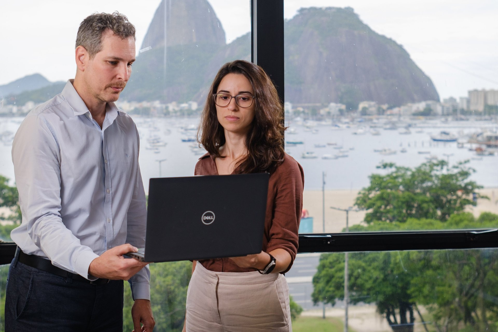 Working with the backdrop of Guanabara Bay requires technical mastery to balance the internal light of the office with the intense brightness outside (contraluz), ensuring that both the executive and the landscape are perfectly exposed.